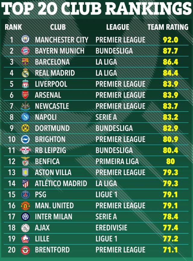 뮌헨에 이어 올 시즌 라리가 우승을 차지한 바르셀로나(3위)와 레알 마드리드(4위)가 자리했으며, 리버풀, 아스널, 뉴캐슬이 각각 5위 6위, 7위를 차지했다. 김민재가 올 시즌 활약한 나폴리는 세리에A 우승에도 불구하고 프리미어리그 팀들에 밀려 8위에 올랐다.