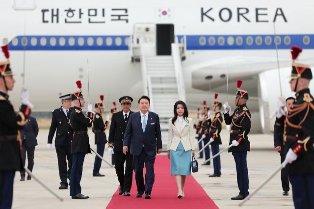 尹大統領は夫人の金建希(キム・ゴンヒ)女史とともに大統領専用機である空軍1号機でパリのオルリー空港に到着した。フランス政府側からフィリップ・ルポル駐韓フランス大使をはじめ、韓国側からはチェ・ジェチョル駐フランス大使、アン・イルファン駐経済協力開発機構(OECD)韓国代表部大使、パク・サンミ駐ユネスコ(UNESCO)韓国代表部大使らが出席し、尹大統領夫妻を迎えた。