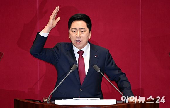 김 대표는 이날 국회 본회의장에서 열린 국회 교섭단체 대표연설에서 "사법리스크, 돈봉투 비리, 남탓 전문, 말로만 특권 포기, '사돈남말' 정당 대표로서 하실 말씀은 아니었다"며 이같이 말했다. 이날 연설은 김 대표의 여당 대표 취임 후 첫 국회연설이다.