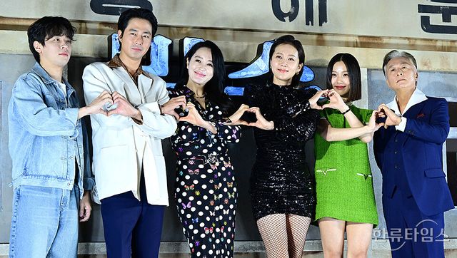 배우 김혜수, 염정아, 조인성, 박정민, 김종수, 고민시가 20일 오전 서울 자양동 롯데시네마 건대입구점에서 열린 영화 '밀수' 제작보고회에 참석해 포토타임을 갖고 있다.