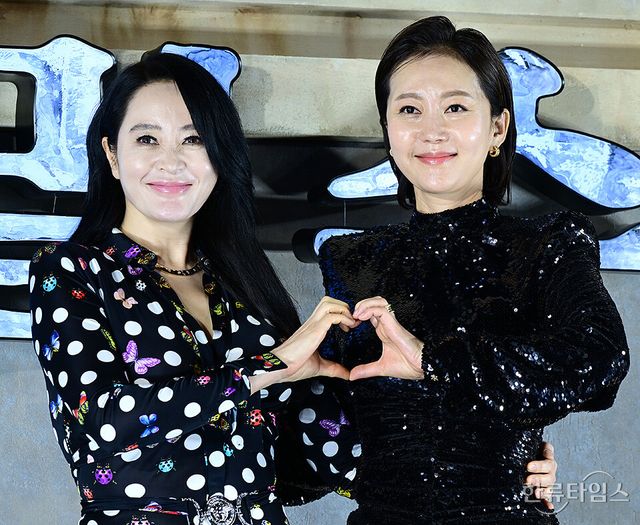 배우 김혜수, 염정아가 20일 오전 서울 자양동 롯데시네마 건대입구점에서 열린 영화 '밀수' 제작보고회에 참석해 포토타임을 갖고 있다.