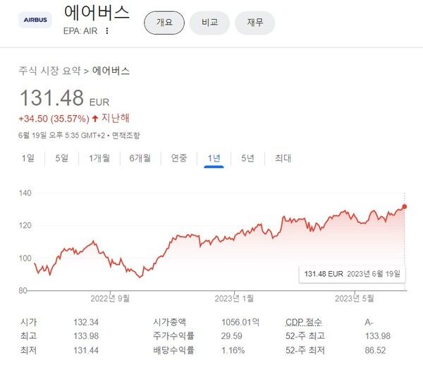 사진=에어버스 2022년 6월 ~2023년 6월 주가