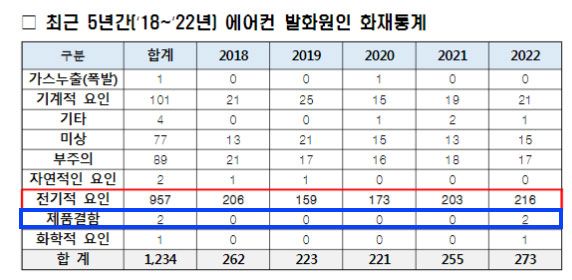 소방청에 따르면 에어컨 화재의 원인은 전기적 요인이 75.4%로 가장 많았다. 2022년에만 216건으로 5년간 합계는 957건이다. 나머지는 기계적 요인이 101건(8.1%), 부주의가 89건(8.6%) 등이다.