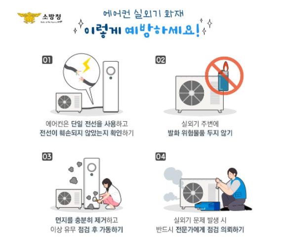 에어컨 실외기 화재 에방을 위해서는 ▲단일 전선을 사용하고, 전선이 훼손되지 않았는지 확인하기, ▲실외기 주변에 발화 위험물을 두지 않기, ▲먼지를 충분히 제거하고 이상 유무 점검 후 가동하기, ▲실외기 문제 발생 시 반드시 전문가에에 점검 의뢰하기 등이 필요하다.