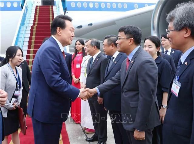 Đón Tổng thống Yoon và phu nhân tại sân bay có Chủ nhiệm Văn phòng Chủ tịch nước Lê Khánh Hải, Chủ tịch UBND TP Hà Nội Trần Sỹ Thanh, Thứ trưởng Bộ Ngoại giao Nguyễn Minh Vũ, Đại sứ Việt Nam tại Hàn Quốc Nguyễn Vũ Tùng, Đại sứ Hàn Quốc tại Việt Nam Oh Young-ju cùng đại diện một số cơ quan.