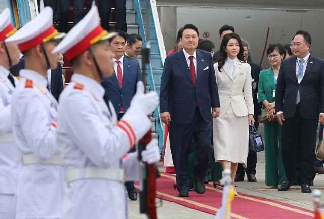 Tổng thống Yoon Suk-yeol và phu nhân Kim Keon-hee đã hạ cánh xuống Sân bay Quốc tế Nội Bài (Hà Nội) vào sáng ngày ngày 22 (theo giờ địa phương), bắt đầu cho chuyến thăm cấp nhà nước Việt Nam. [Ảnh=Yonhap News]