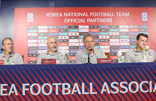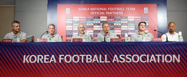 클린스만 한국 대표팀 감독과 안드레아스 헤어초크 수석코치, 파올로 스트링가라 코치, 안드레아스 쾨프케 골키퍼 코치, 베르너 로이타드 피지컬 코치, 마이클 킴 코치가 22일 오후 서울 종로구 축구회관에서 기자회견을 진행했다.