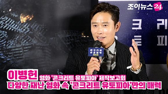 배우 이병헌이 지난 21일 오전 서울 광진구 자양동 롯데시네마 건대입구점에서 열린 영화 '콘크리트 유토피아'(감독 엄태화) 제작보고회에 참석해 소감을 말하고 있다. [영상=정소희, 문수지 기자]