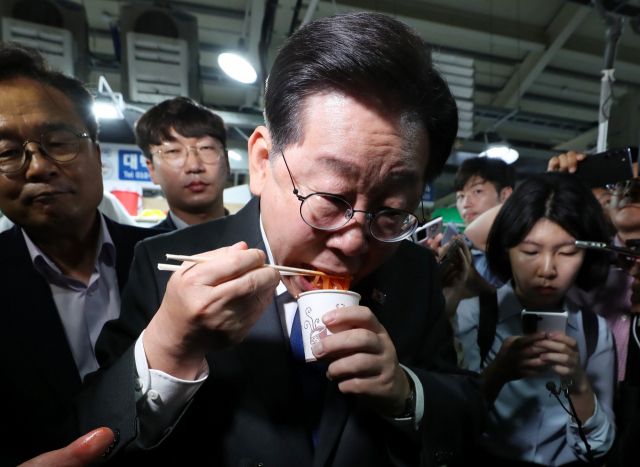 ▲더불어민주당 이재명 대표가 22일 강원 강릉시 주문진 좌판풍물시장에서 산오징어를 시식하고 있다. ⓒ연합뉴스