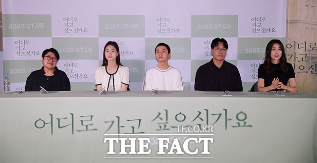 배우 문우진과 정민주, 김희정 감독, 박하선, 김남희(왼쪽부터)가 22일 오후 서울 광진구 롯데시네마 건대입구점에서 열린 영화 '어디로 가고 싶으신가요' 배급 시사회에 참석해 포즈를 취하고 있다. /장윤석 인턴기자