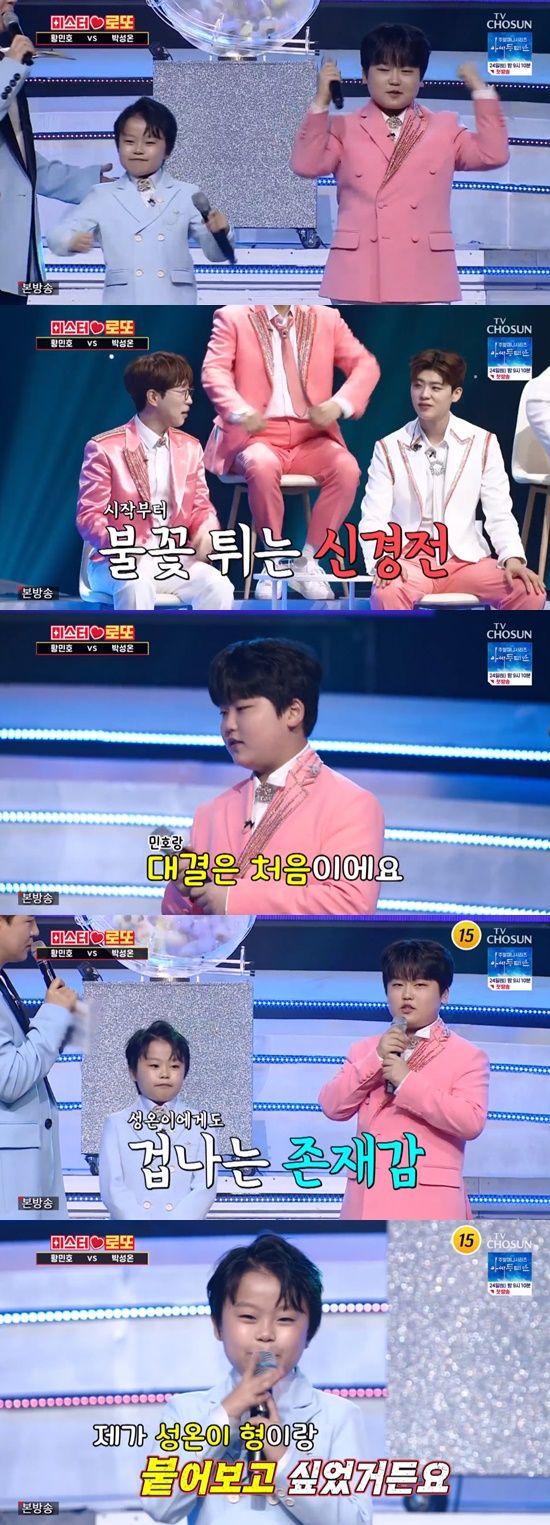 박성온과 황민호는 '어린이 대결'을 펼쳤다. 박성온은 "민호와의 대결은 처음"이라며 "민호는 말이 필요 없다. 너무 잘하는 동생이고, 대결해도 되는지 무서운 동생"이라고 말했다.