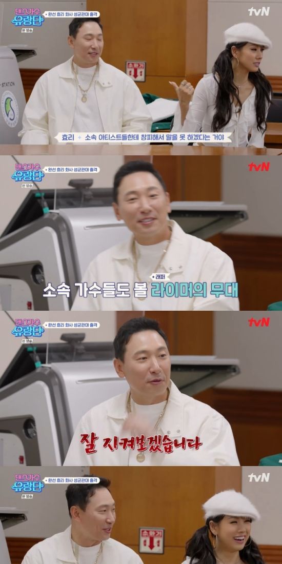 또 이효리는 "(라이머가) 소속 아티스트들한테 창피해서 말을 못하겠다더라"라며 귀띔했고, 라이머는 "혼내고 그랬는데 갑자기 내가 하니까 애들이 '잘 지켜보겠습니다' 하고 문자를 보냈다"라며 고백했다.