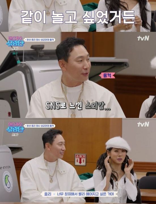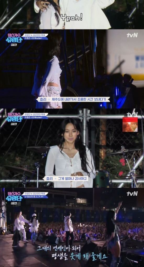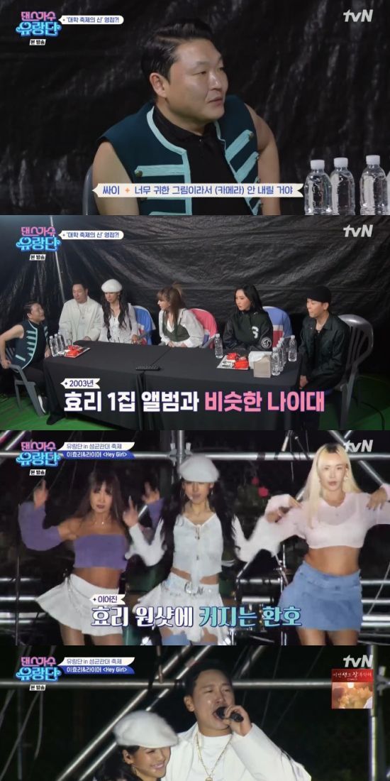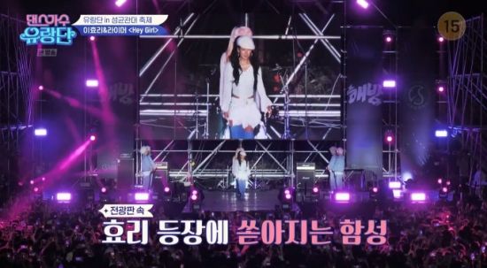 22일 방송된 tvN '댄스가수 유랑단'에서는 김완선, 이효리, 화사가 성균관대학교 축제에서 공연하는 장면이 전파를 탔다.