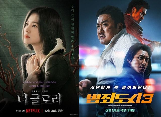 올해 상반기 기준 안방극장과 스크린에서 각각 최고 화제작으로 꼽힌 넷플릭스 시리즈 '더 글로리'와 영화 '범죄도시3'의 포스터의 모습. 공교롭게도 지난해 말보다 크게 주가가 내린 콘텐츠 제작사 스튜디오드래곤과 콘텐트리중앙이 각각 제작에 참여한 작품이다. /넷플릭스, 플러스엠엔터테인먼트 제공