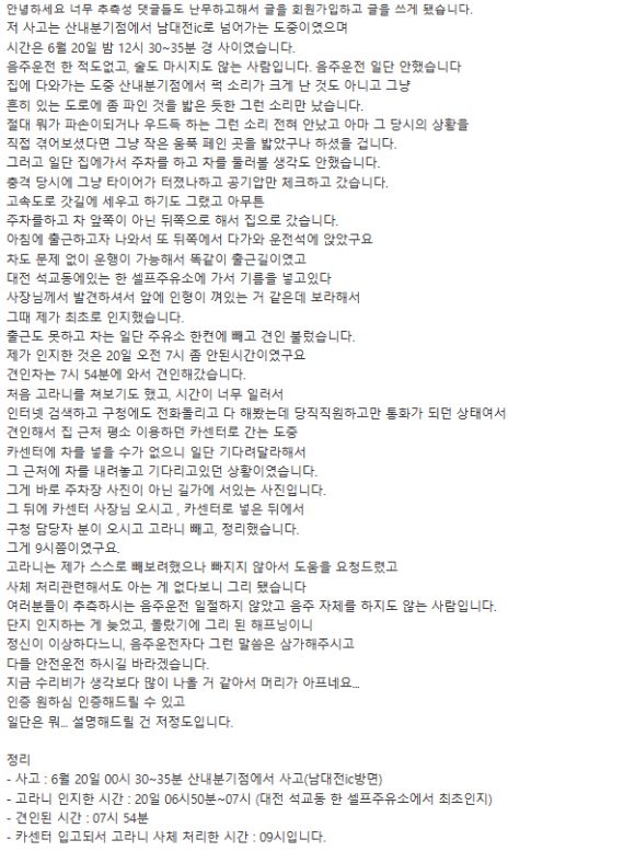 본인을 해당 차주라고 말한 A씨는 "늦은 밤 남대전 IC로 넘어가던 도중 차가 가볍게 덜컹거려 도로 파인 부분을 밟았다고 생각했다"라며 "집에 도착해 차를 둘러볼 생각도 안 하고 타이어가 터졌는지 공기압만 체크하고 내렸다"며 "출근할 때는 뒤쪽으로 다가와 운전석에 앉았다"고 설명했다.