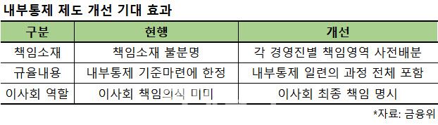 성태윤 연세대 경제학부 교수는 “오랫동안 내부통제에 대한 책임 소재가 불분명해 문제가 있던 만큼 이에 대한 조치는 필요해 보인다”며 “제도의 실효성 제고와 보완 방안은 향후 법제화를 해나가는 과정에서 찾아가야 할 것”이라고 말했다.