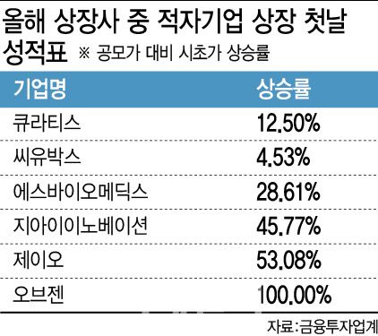 22일 금융투자업계에 따르면 올해 신규 상장한 기업 중 적자 기업이 상장한 사례는 큐라티스(348080)와 씨유박스(340810), 에스바이오메딕스(304360), 지아이이노베이션(358570), 제이오(418550), 오브젠(417860) 등이다. 오브젠은 공모가 대비 두 배 뛴 가격이 시초가로 형성됐다. 제이오와 에스바이오메딕스, 씨유박스, 큐라티스의 상장 첫날 시초가는 공모가 대비 각각 53.08%, 28.61%, 4.53%, 12.5% 오른 가격에 형성됐다.