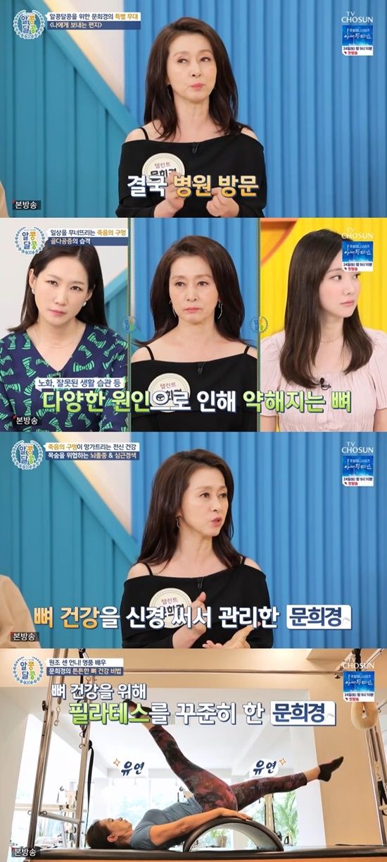 문희경은 "100세 시대에 어떻게 건강하게 살아갈까 고민하고 있다. 뼈 건강에 신경을 쓰다 보니까 체력이 좋아지는 것이 느껴지더라"며 필라테스와 108배까지 꾸준히 몸을 움직이며 건강을 지키려 한다고 설명했다.