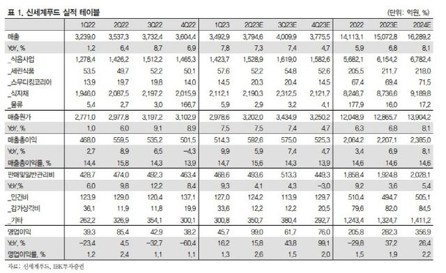 남 연구원은 긍정적인 실적을 예상하는 이유에 대해 “그룹내 유통망 확대 및 SKU 증가와 단체급식 사업부 적자 사이트 감소에 따른 수익성 개선, 노브랜드버거 가맹점 출점 및 업황 회복이 기대되기 때문”이라 진단했다.
