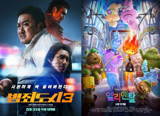 [이데일리 스타in 김보영 기자] ‘범죄도시3’가 개봉 4주차 주말을 앞두고 신작 공세에도 굳건히 박스오피스 1위를 지키고 있다. 이와 함께 디즈니 픽사 애니메이션 ‘엘리멘탈’이 관객들의 입소문에 힘입어 상승세를 기록, 개봉 이후 예매율 1위를 꿰차며 흥행 역주행의 조짐을 보이고 있다.