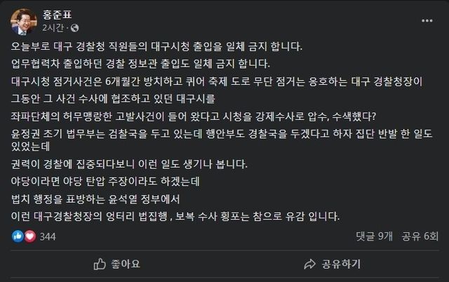 홍 시장은 이날 자신의 페이스북을 통해 “업무협력 차 출입하던 경찰 정보관 출입도 일체 금지한다”며 “대구시청 점거사건은 6개월간 방치하고 퀴어 축제 도로 무단점거는 옹호하는 대구 경찰청장이 그 동안 사건 수사에 협조하고 있던 대구시를 좌파 단체의 허무맹랑한 고발사건이 들어왔다고 시청을 강제수사로 압수수색했다”고 지적했다.