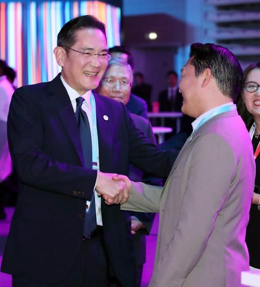 当地时间6月21日,在法国巴黎,韩国总统尹锡悦举办“釜山世界博览会官方招待会”。图为三星电子会长李在镕(左)和歌手鸟叔PSY握手致意。 【图片提供 韩联社】