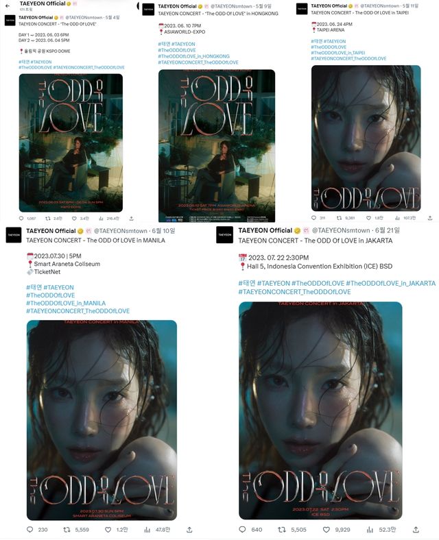앞서 지난달 4일 태연의 공식 계정에 서울 콘서트 투어 포스터가 공개됐다. 이어 9일에는 홍콩 포스터와, 11일 대만 포스터 사진이 올라왔다.