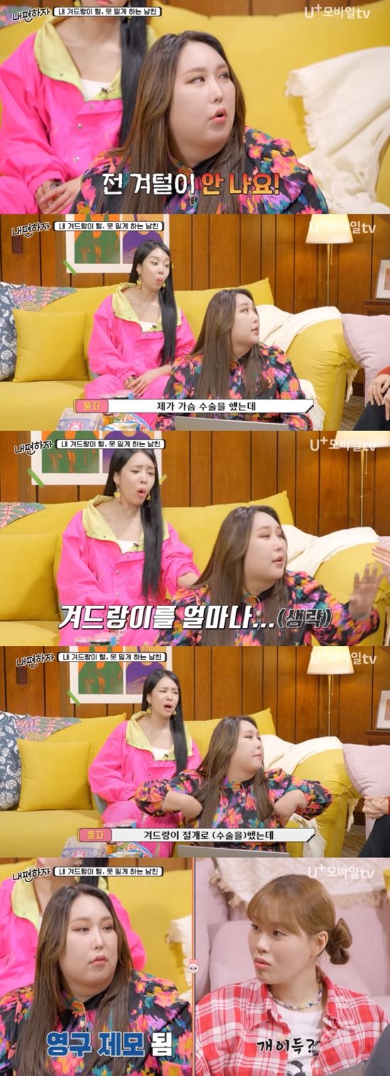 그러면서 "겨드랑이 절개로 수술을 했는데 거기를 수술하니까 (겨드랑이털이) 아예 안 나더라"라고 뜻밖의 영구 제모된 소식을 고백했다.