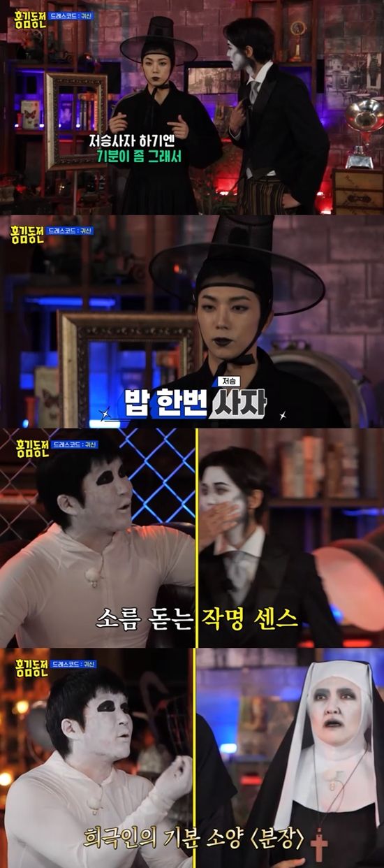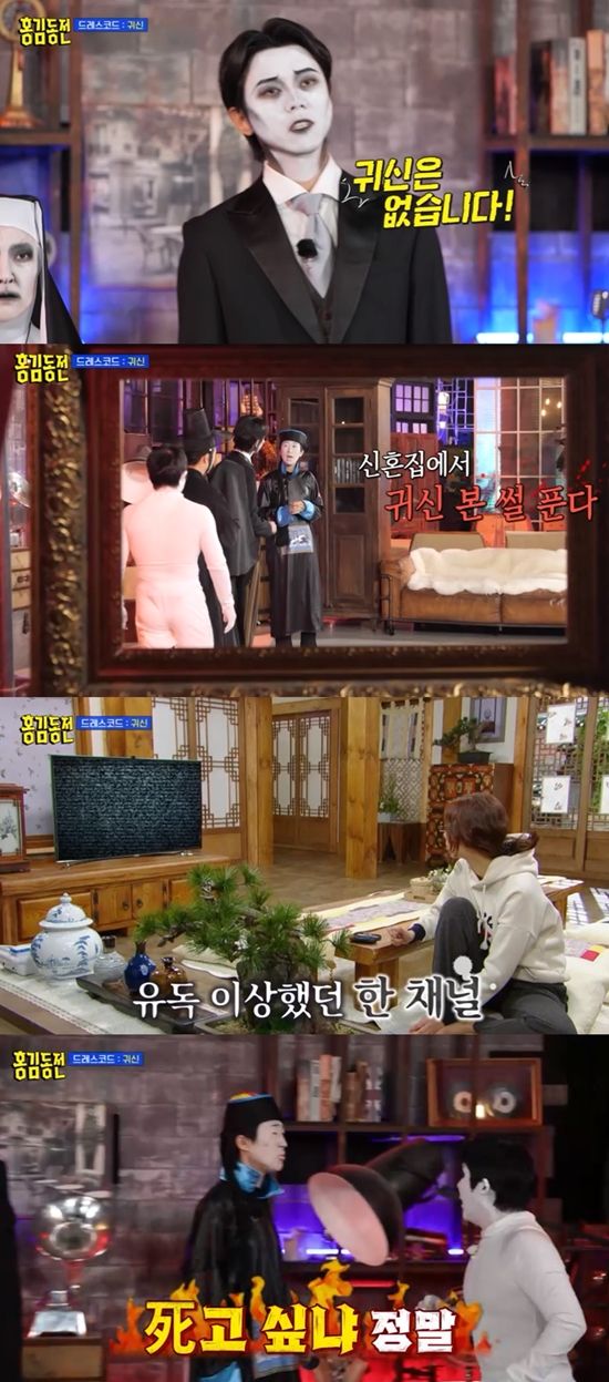 이날 멤버들은 귀신 분장을 하고 등장해 이목을 집중시켰다. 조세호는 '주온' 토시오, 우영은 저승사자, 주우재는 '유령신부' 빅터, 김숙은 '컨저링' 수녀 귀신, 마지막으로 홍진경은 강시로 분했다.