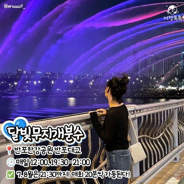 반포대교 달빛무지개분수 시간표와 반포대교 가는법, 포토존 등 더 자세한 정보는 이 곳을 클릭하셔서 확인하시면 되겠습니다.