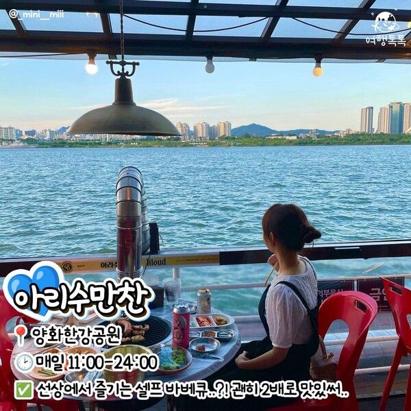 양화한강공원에 위치한 '아리수만찬'에서는 한강 위의 선착장에서 직접 고기를 구워먹을 수 있는 '셀프 바베큐 식당'입니다. 야외 테이블 이용료는 1,000원이며 테이블 당 5,000원에 숯불을 제공하고 있는데요. 총 이용가능한 시간은 2시간입니다.