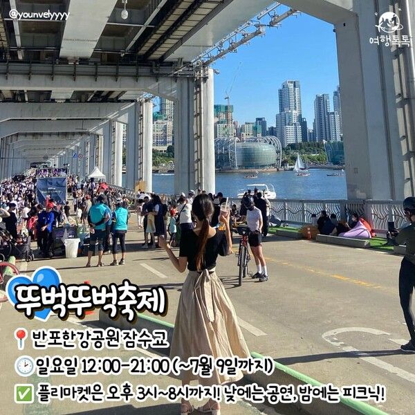 잠수교는 7월 9일까지 매주 일요일이 되면 차량 통행이 제한되는데요. '뚜벅뚜벅 축제'가 개최되기 때문입니다. 두달간만 운영되는 축제로 7월 한강에 방문한다면 가볼만한 놀거리인데요. 간단한 음식과 플리마켓들이 설치되는 것은 물론, 퍼레이드와 버스킹 등 눈과 귀가 즐거운 프로그램들을 일요일마다 볼 수 있습니다.