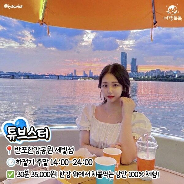 튜브스터는 직접 보트를 운전할 수 있으며 주류를 제외한 모든 종류의 식음료 취식이 가능해 밝은 낮에도, 노을지는 저녁에도, 어두운 밤에도 이용하기 좋은 놀거리입니다. 밤 12시까지 운영하기 때문에 한강에서 늦게까지 탑승할 수 있는 놀거리이기도 해 많은 분들이 이용하고 있습니다.