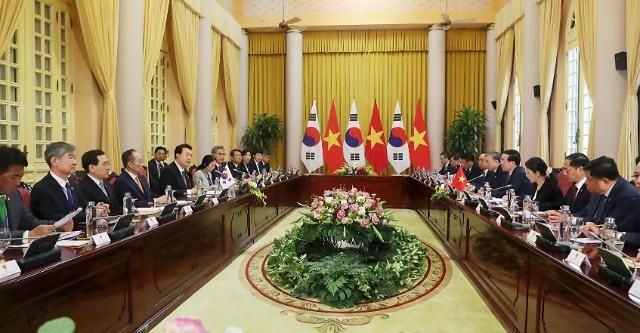 베트남을 국빈 방문 중인 윤석열 대통령이 6월 23일(현지시간) 하노이 주석궁에서 보 반 트엉 베트남 국가주석과 한·베트남 정상회담을 하고 있다. [사진=연합뉴스]