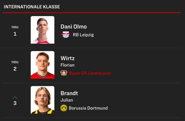 그 뒤를 이어 토마스 뮐러(바이에른 뮌헨)이 이름을 올렸고, 안드레이 크라마리치(호펜하임), 플로리안 카인츠(쾰른), 마리오 괴체(프랑크푸르트) 그리고 라스 슈틴들(보루시아 묀헨글라트바흐)가 포함됐다.