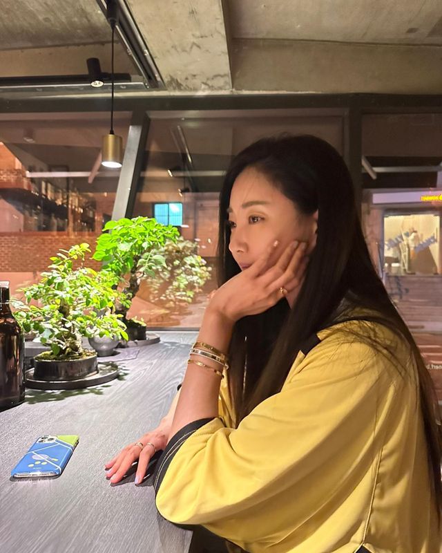 공개된 사진 속 김사랑은 카페로 보이는 곳에서 테이블에 기댄 채 그윽한 눈빛으로 앞을 응시하고 있다.