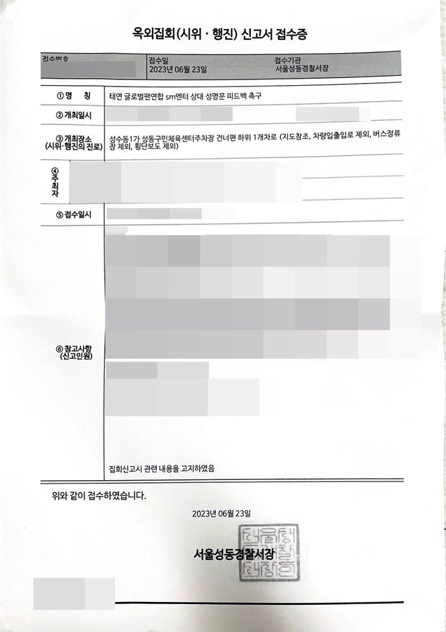 그러나 이후에도 신고가 계속 들어와 태연 팬덤 측은 서울 성동 경찰서에 시위를 신고하면 진행할 수 있다는 점을 알게 돼 합법적으로 시위를 진행하고자 집회 신고를 완료하면서 합법적인 시위가 됐다.