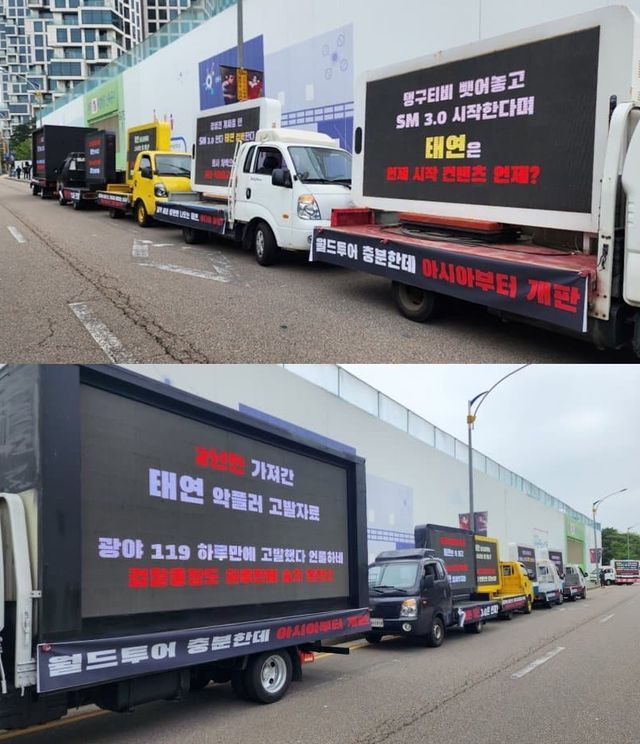 태연 팬들은 태연의 소속사 SM에 대해 불만이 있어도 한 번도 트럭 시위를 진행한 적이 없었다고 전하며, 현재 아시아 투어를 비롯해 열심히 활동 중인 태연을 방치하고 있는 것에 대해 행동에 나서게 됐다고 말했다.