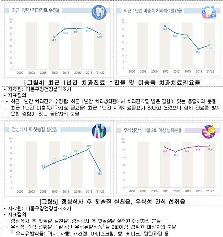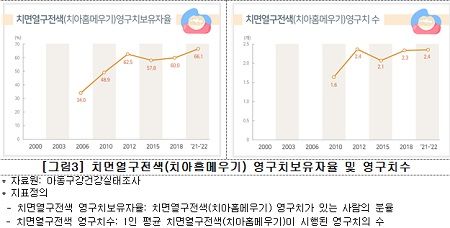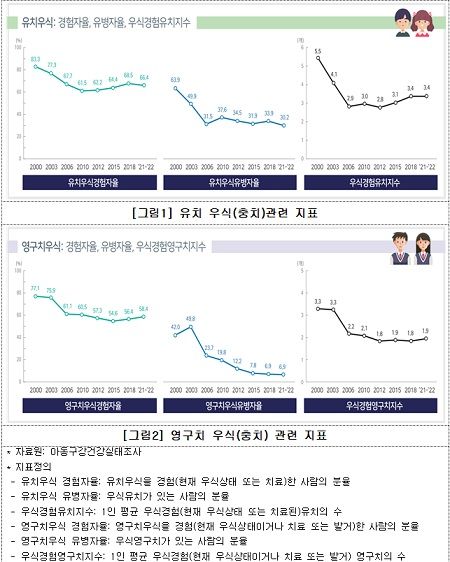 ‘2021-2022년 아동구강건강실태조사’ 결과 최근 약 10년간 아동의 구강건강 수준 정체, 치아우식 발생 예방을 위한 구강건강관리 행태 개선이 필요한 것으로 나타났다.