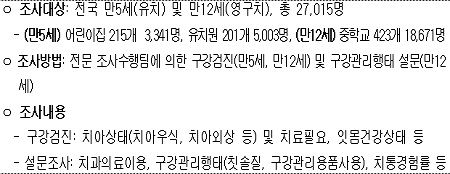 질병관리청(청장 지영미)에 따르면 이번 조사결과는 2000년 처음으로 조사를 실시한 이후 8번째조사이며(3년마다 실시), 유치 건강상태를 대표하는 만5세와 영구치 건강상태를 대표하는 만12세 아동을 대상으로 치과의사가 각 기관을 방문하여 구강검진과 설문조사를 했다