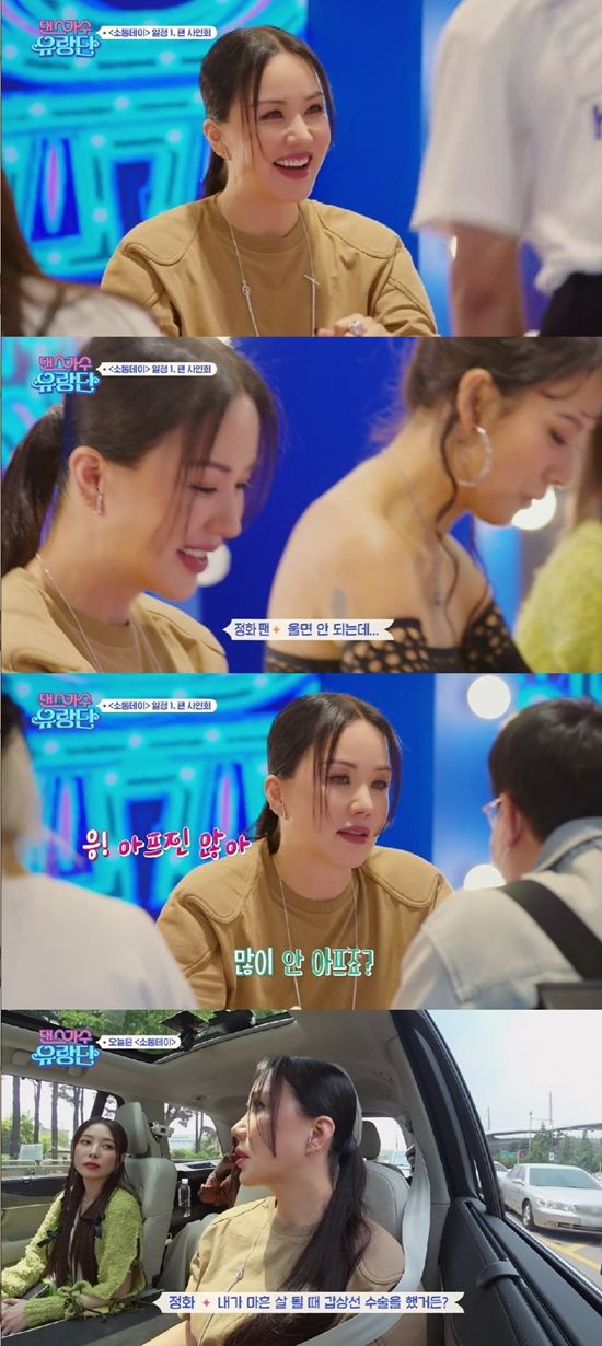 팬 사인회를 끝나고 돌아가는 길 홍현희는 "팬들이 다 그 얘길 하더라. 건강하시라고"라며 엄정화에게 말을 건넸다. 엄정화는 "내가 생각해 보니까 마흔 살 때 갑상선 수술을 했다. 그 이후에 팬미팅을 해 본 적이 없다. 얘네는 그런 말을 하고 싶었던 것 같다"라고 설명했다.