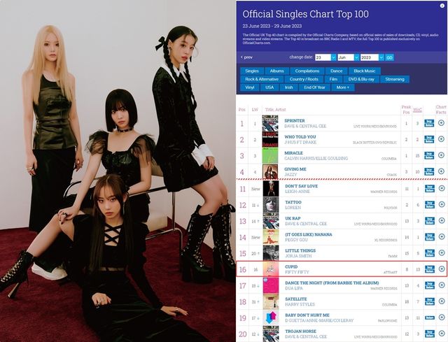 영국 ‘오피셜 싱글 차트 톱 100’ 23일자 차트에서 피프티 피프티의 ‘CUPID(Twin Ver.)‘가 지난주에 이어 또 다시 16위를 기록했다. 13주 연속 ‘오피셜 싱글 차트 톱 100’ 진입으로 이제 피프티 피프티는 해당 차트에 가장 오랜 머문 K팝 걸그룹이 됐다.