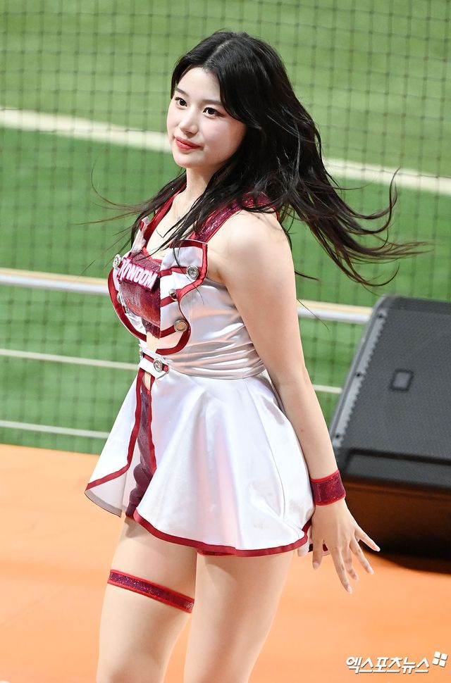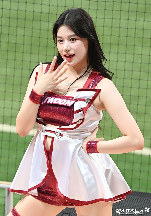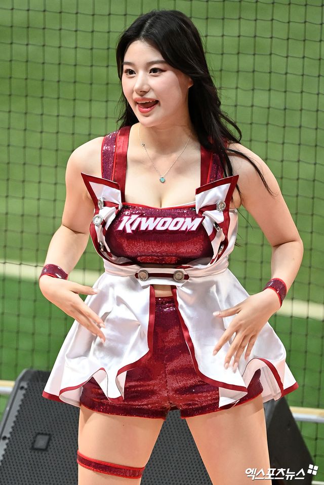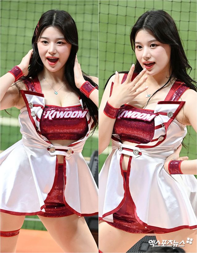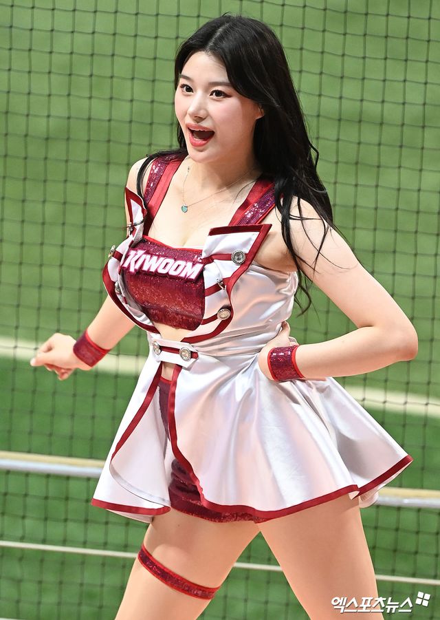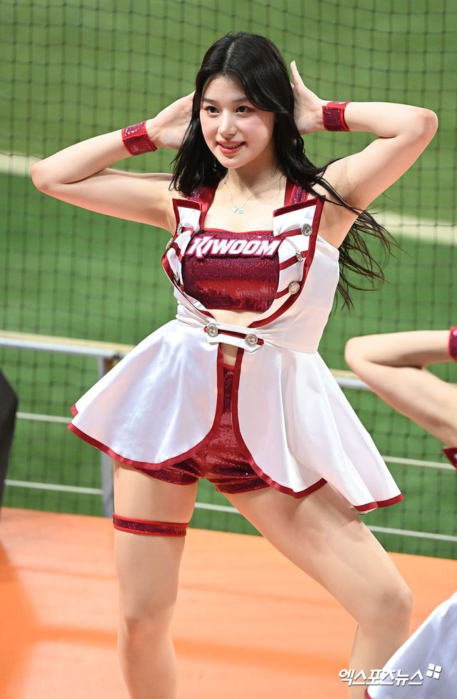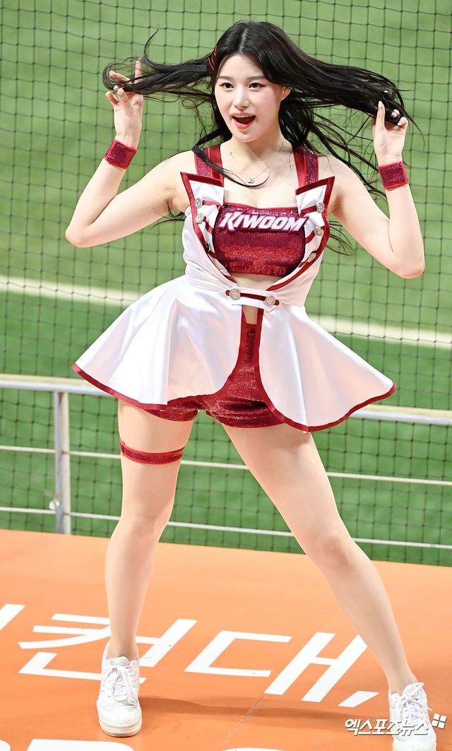 (엑스포츠뉴스 고척, 김한준 기자) 24일 오후 서울 구로구 고척스카이돔에서 열린 '2023 신한은행 SOL KBO리그' 두산 베어스와 키움 히어로즈의 경기, 키움 치어리더 이예빈이 멋진 공연을 선보이고 있다.