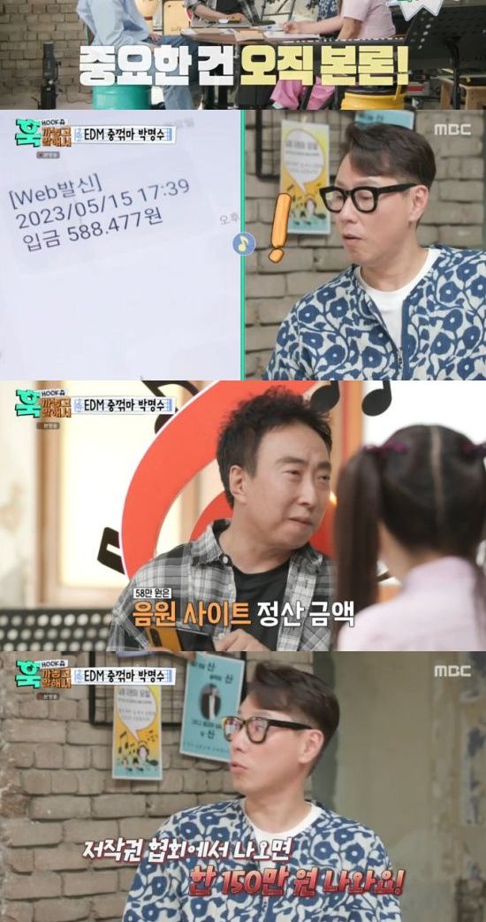 박명수는 '발표한 곡은 몇 곡이냐'라는 질문에 대해 "한 10곡 정도 된다. 얼마 전에 입금된 거 보여드리겠다. 저는 이런 거 숨기지 않는다. 58만 원. 이 58만 원은 음원 사이트. 저작권 협회에서 나오면 한 150만 원 나온다"라며 저작권료를 공개했다. 조현아는 "(수입이) 짭짤하다"라며 감탄했고, 박명수는 "그걸로 만족하지 않는다"라며 못박았다.