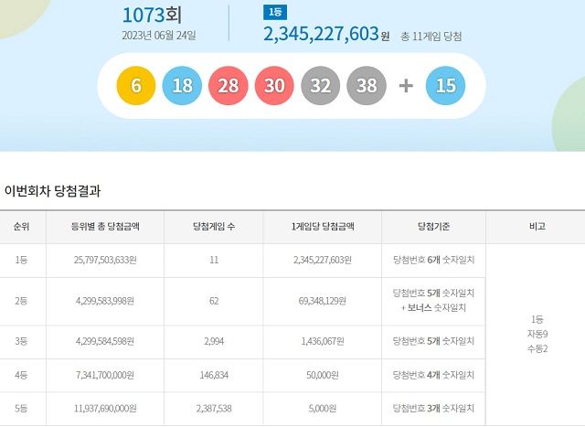 1073회 로또 당첨번호 '6, 18, 28, 30, 32, 38'···보너스 번호 '15'