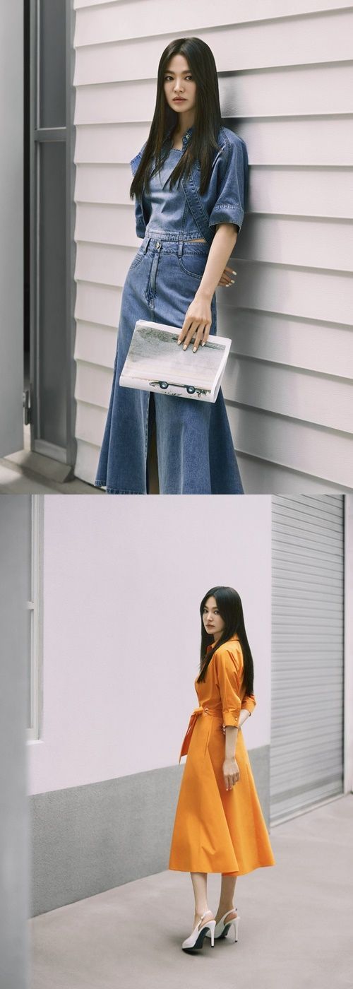 송혜교는 배색 컬러가 돋보이는 셔츠 카라 형태의 A라인 원피스, 레글런 소매와 플레어 라인이 특징인 데님 셋업 등 다양한 아이템을 그녀만의 고급스러운 분위기로 재해석해 감탄을 자아낸다.