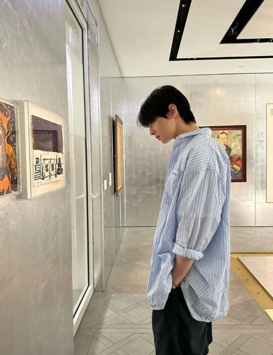 공개된 사진에는 전시회를 관람 중인 차은우의 모습이 담겼다. 소멸할 듯한 소두가 눈길을 끈다.