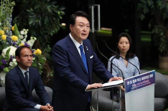윤석열 대통령이 20일(현지시간) 파리에 위치한 세계 최대 스타트업 캠퍼스인 '스테이션 에프(F)' 에서 열린 한·프랑스 미래혁신세대와의 대화에서 발언하고 있다. [사진=연합뉴스]
