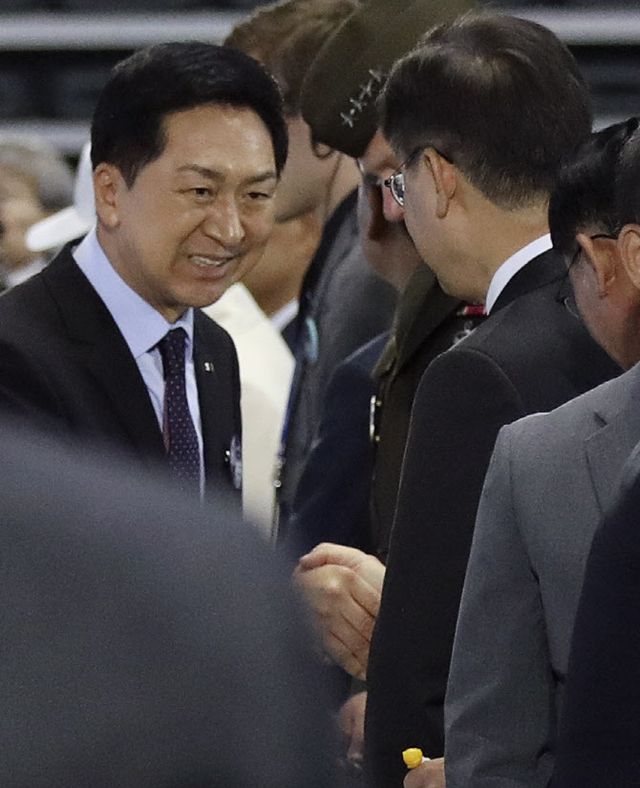 김기현(왼쪽) 국민의힘 대표와 이재명 더불어민주당 대표가 25일 오전 서울 중구 장충체육관에서 열린 제73주년 6·25전쟁 기념식에 참석해 악수하고 있다. (사진=뉴시스)
