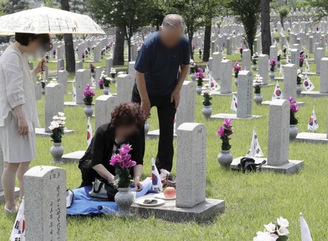 6.25전쟁 73주년인 25일 동작구 국립서울현충원에서 최봉순(65)씨 가족이 6.25전쟁에 참전해 순직한 오빠인 최문식 육군 상병의 묘소를 찾아 참배하고 있다.